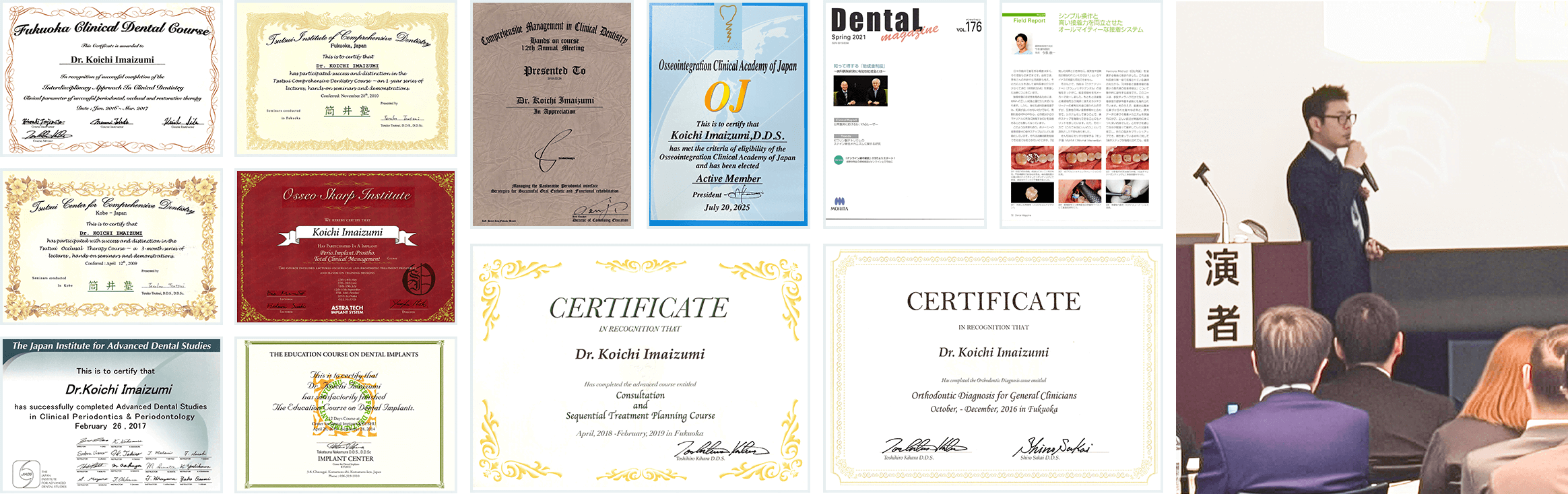 今泉歯科医院の院長・今泉康一は、各種学会やスタディグループに所属し、数多くの研修やコースを修了。さらに、セミナーや講演で歯科医師を指導する立場でもあります。豊富な経験と確かな技術で、一人ひとりに最適な治療を提供しています。