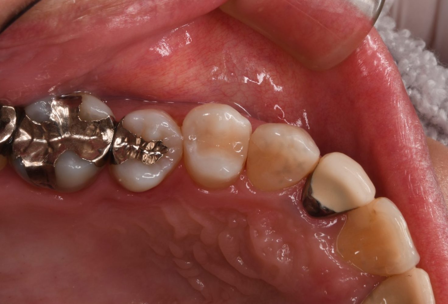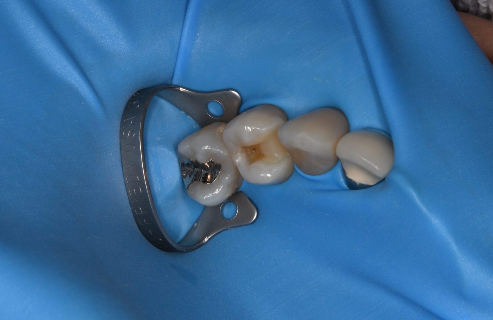 | 治療経過 | 銀歯が外れて来院された。 銀歯が外れた箇所は虫歯になっており、今後虫歯のリスクを軽減させることを目的として、歯への接着力、清掃性に優れたセラミックを用いた修復方法を選択した。 接着操作を行う際には、接着阻害となる唾液や口腔内の水分を遮断するために可能な限りラバーダム防湿を行うように心がけている。 |
