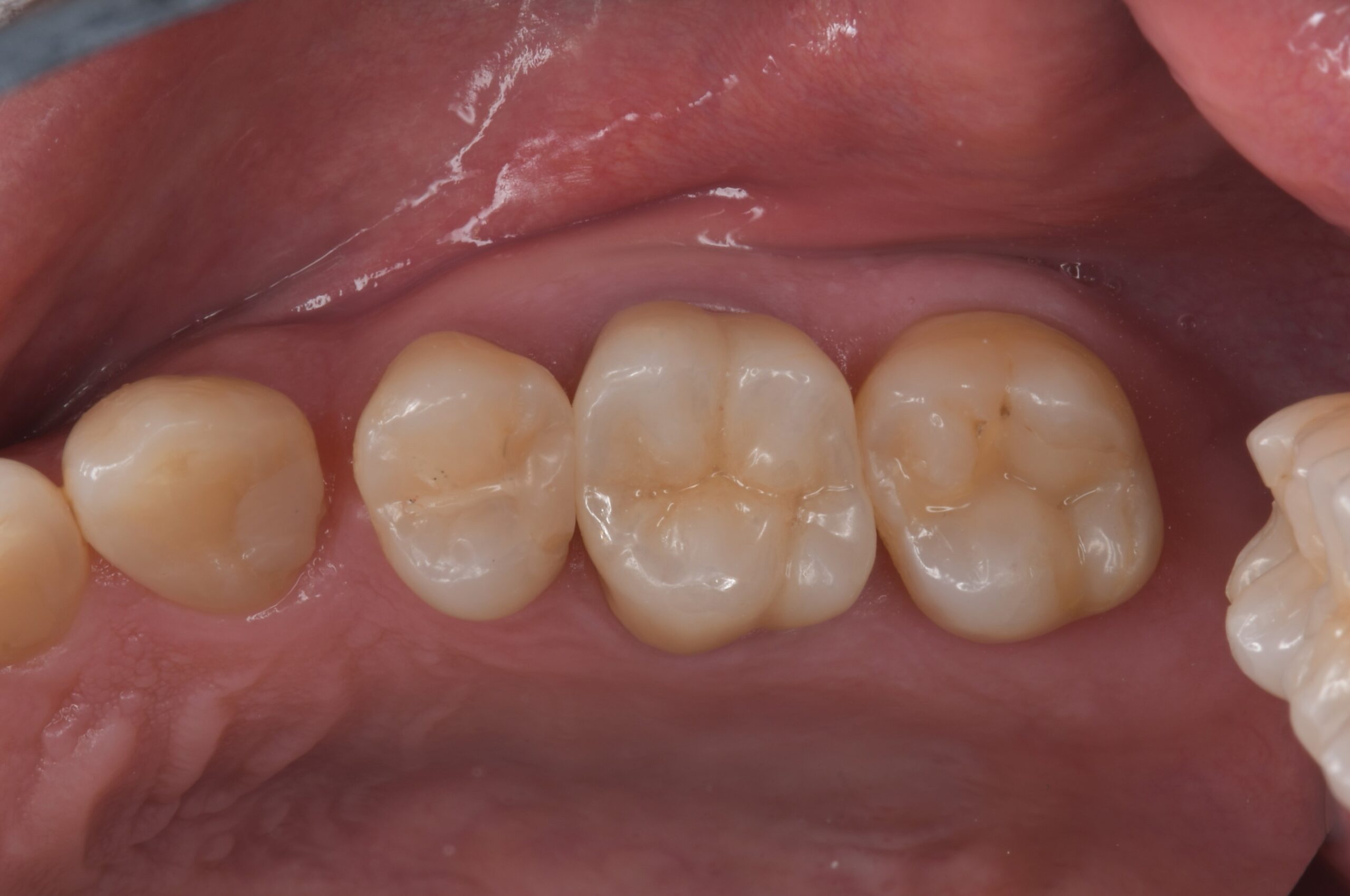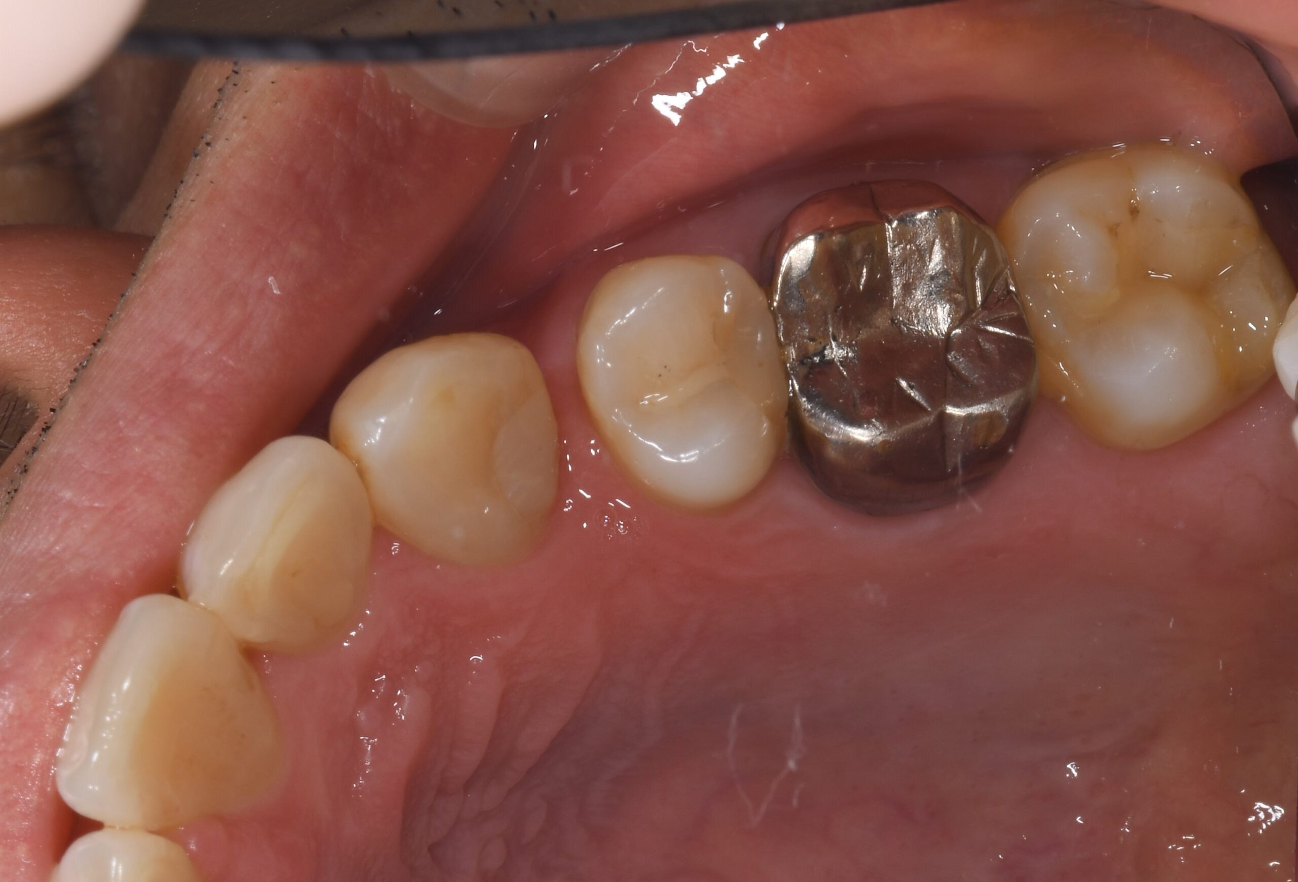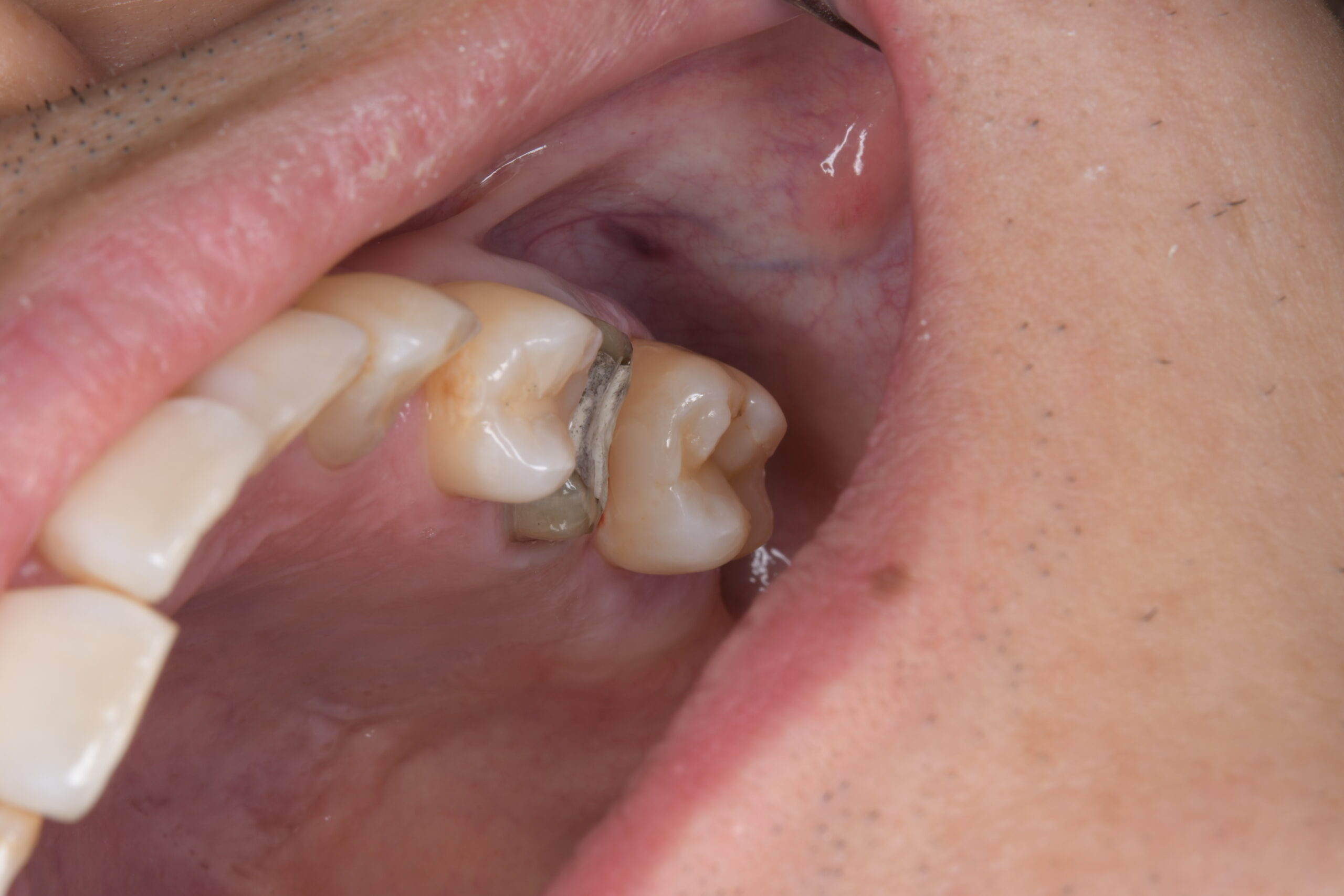 | 治療経過 | メンテナンス中に左上にものが挟まるとのことで治療介入となった。 左上の一番奥の大臼歯の側面に虫歯が確認されたが、虫歯を除去するには上から健康な部分を削ってアプローチする必要が出てくる。 そのため、一つ手前の状態の悪い銀歯を外すことで一番奥の虫歯に側面からアプローチでき、かつ健康な歯質を温存できることを説明し、奥歯二本の治療を行うこととした。 一番奥に関しては虫歯の部分のみ削ってセラミック系の樹脂を埋めるダイレクトボンディングにて、 奥から二番目に関しては内部の金属の補強を外すと虫歯になっていたため、根管治療を行った上でセラミッククラウンで対応することとした。 |