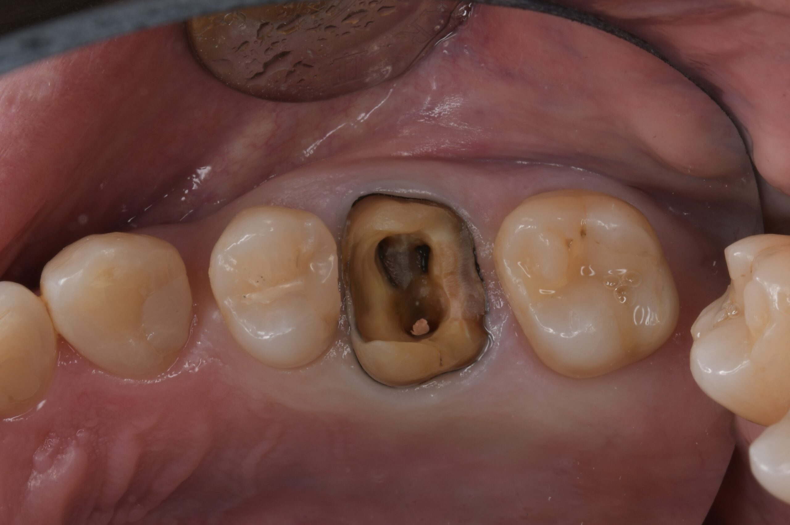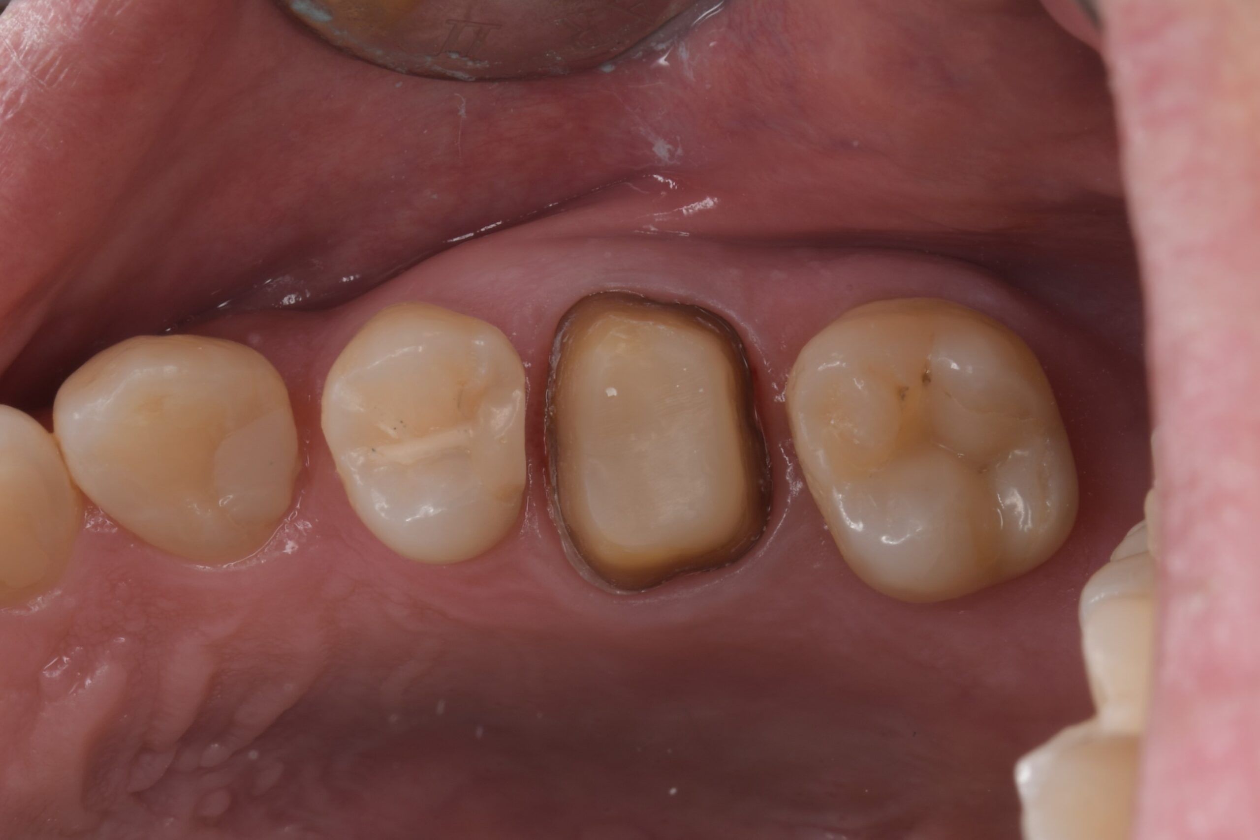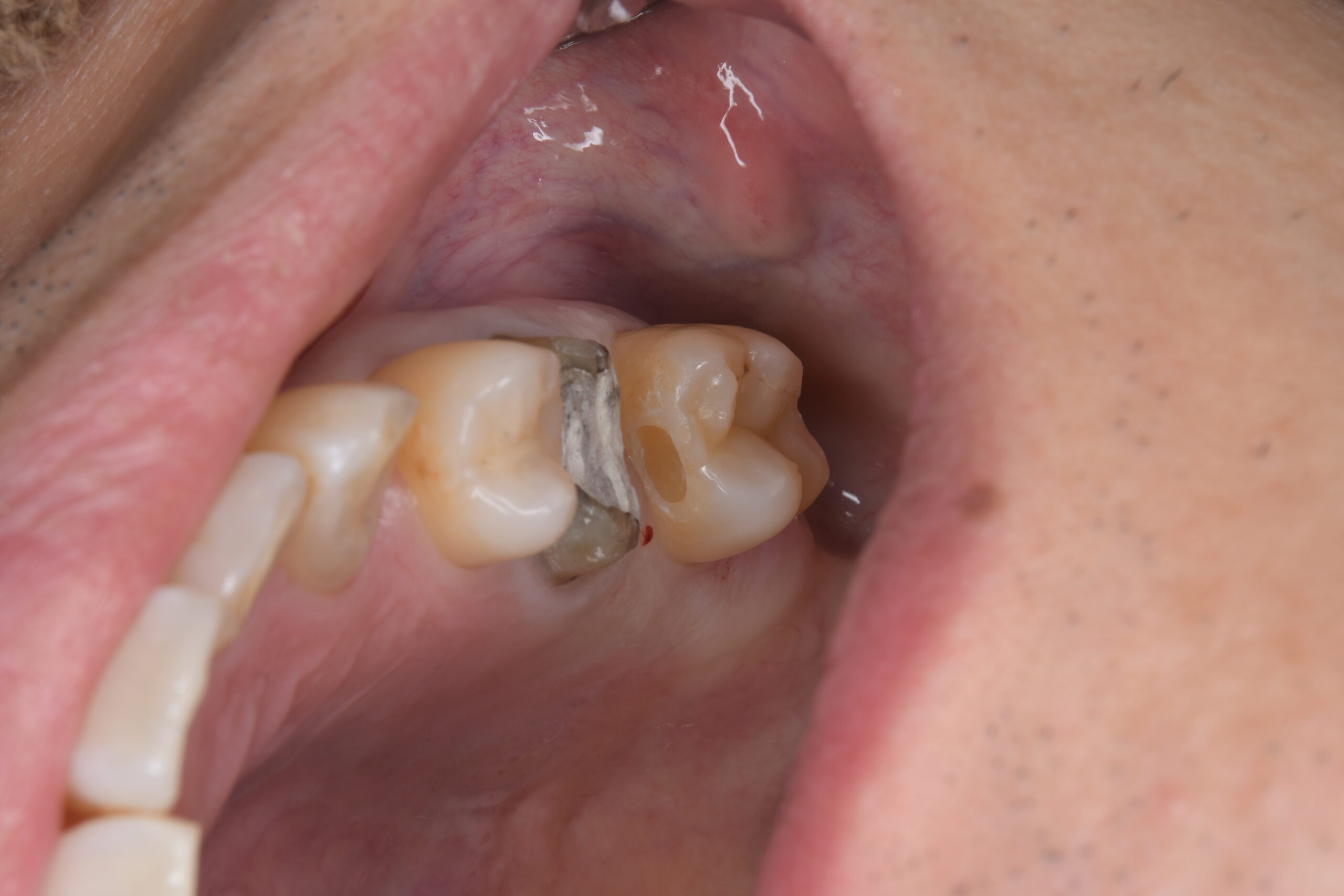 | 治療経過 | メンテナンス中に左上にものが挟まるとのことで治療介入となった。 左上の一番奥の大臼歯の側面に虫歯が確認されたが、虫歯を除去するには上から健康な部分を削ってアプローチする必要が出てくる。 そのため、一つ手前の状態の悪い銀歯を外すことで一番奥の虫歯に側面からアプローチでき、かつ健康な歯質を温存できることを説明し、奥歯二本の治療を行うこととした。 一番奥に関しては虫歯の部分のみ削ってセラミック系の樹脂を埋めるダイレクトボンディングにて、 奥から二番目に関しては内部の金属の補強を外すと虫歯になっていたため、根管治療を行った上でセラミッククラウンで対応することとした。 |