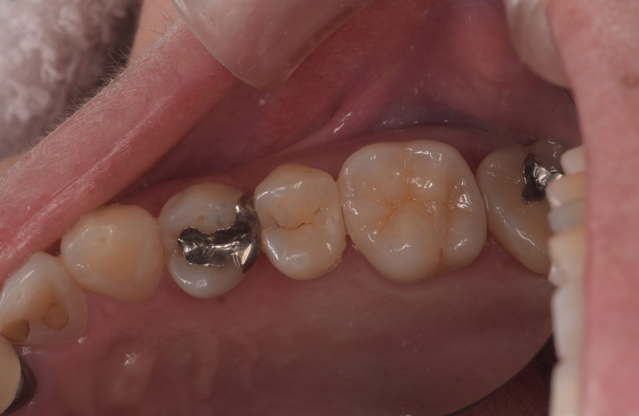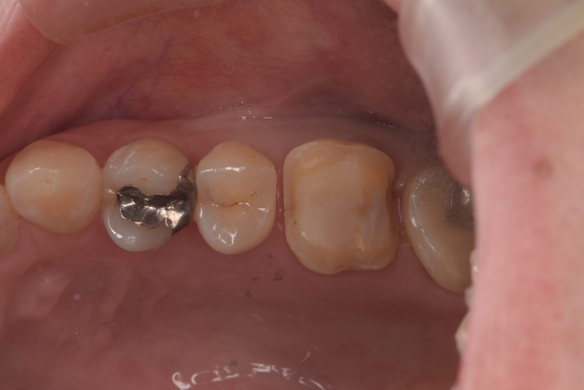 | 治療経過 | メンテナンス希望で来院された。 左上大臼歯に二次う蝕を認めたためセラミックによる治療介入となった。 健全歯質は極力温存したいが、再治療介入のリスクを考慮して、脆弱な歯質は削合し、噛み合わせの面を全てセラミックで被覆するテーブルトップベニアを選択した。 |