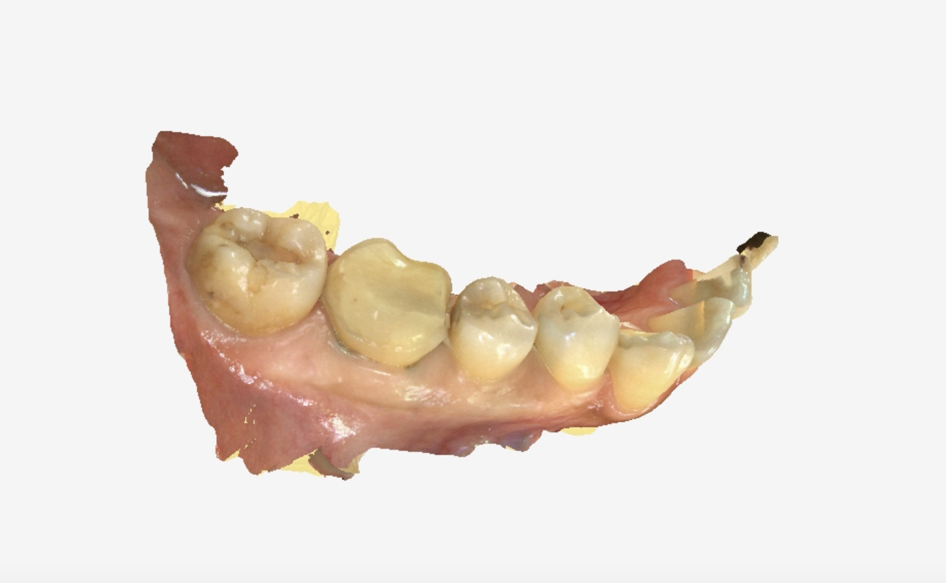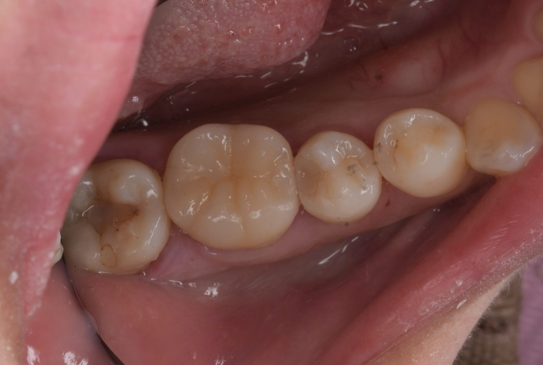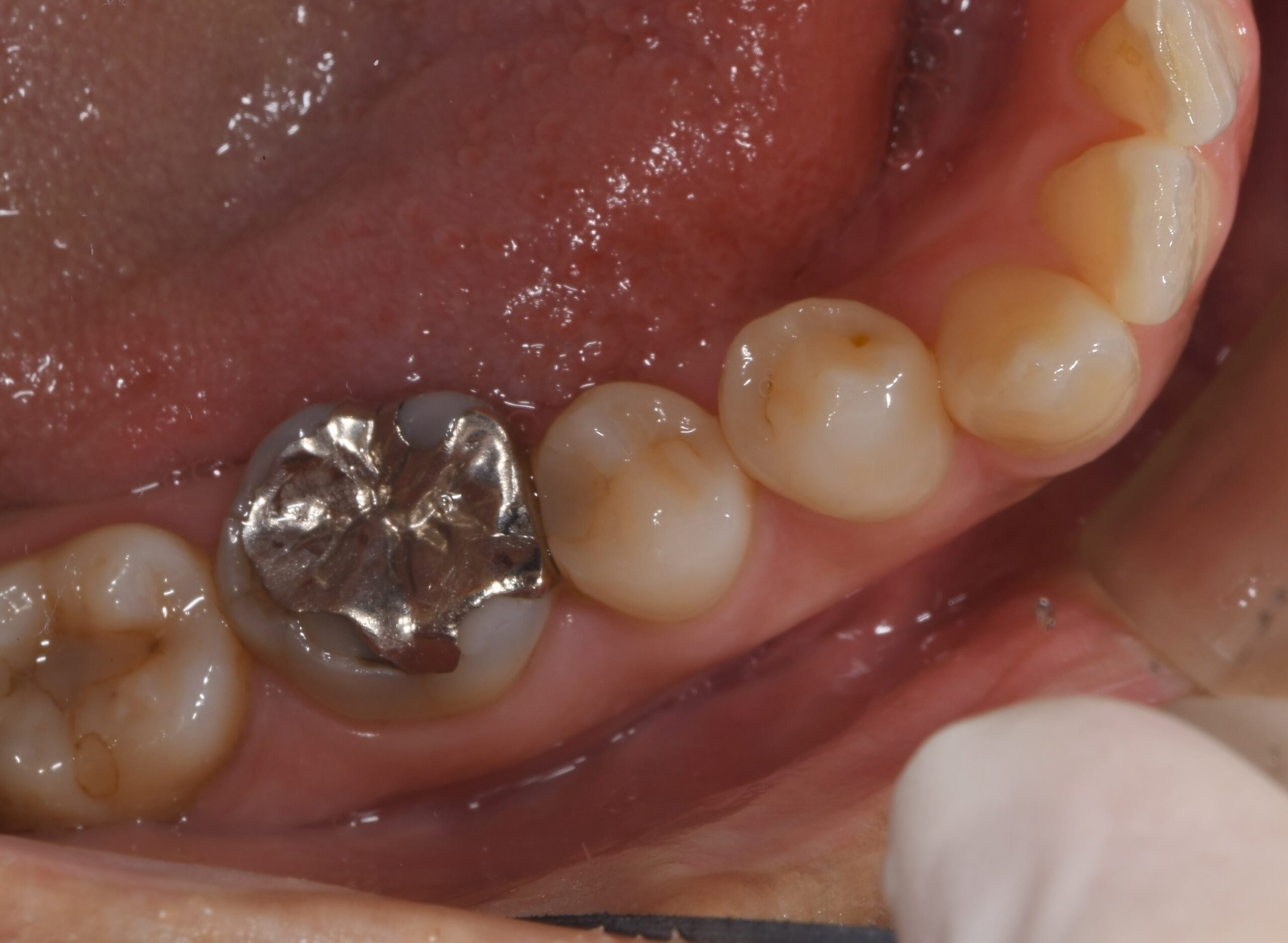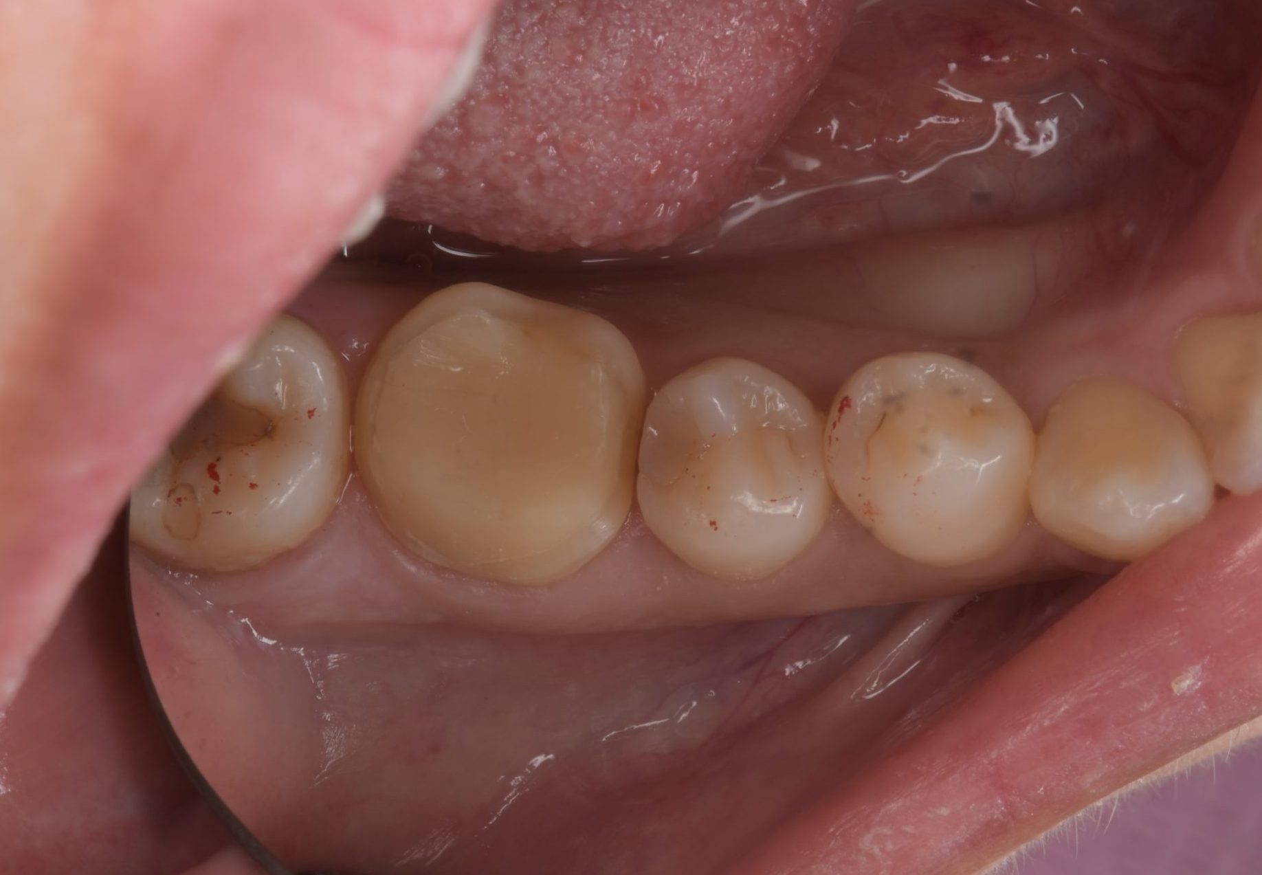 | 治療経過 | メンテナンス来院時に右下がしみるとの訴えがあった。 確認したところ右下大臼歯の銀歯の境目から歯がかけており、二次う蝕の可能性を考えて治療介入となった。 銀歯は歯と化学的に接着できないため、外す虫歯が再発が認めることがほとんどである。 今回は再発のリスクを減らすためにセラミックによる修復を希望された。 脆弱な歯質は削合し、噛み合わせの面を全てセラミックで被覆するテーブルトップベニアを選択した。 セラミックの歯型採りは、現在コンピューターによるデジタルスキャンにて行うようになり、治療精度も一段と向上している。 |