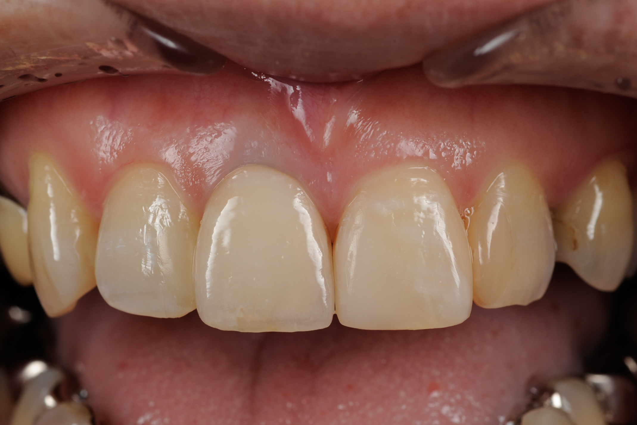 | 治療経過 | 前歯の保険のクラウンをセラミックでやり変えたいとのことで来院された。 隣接する歯にも不適合な修復物があり、天然歯は修復のやり変えと形態修正にてシンメトリーに仕上げていく計画とした。 |