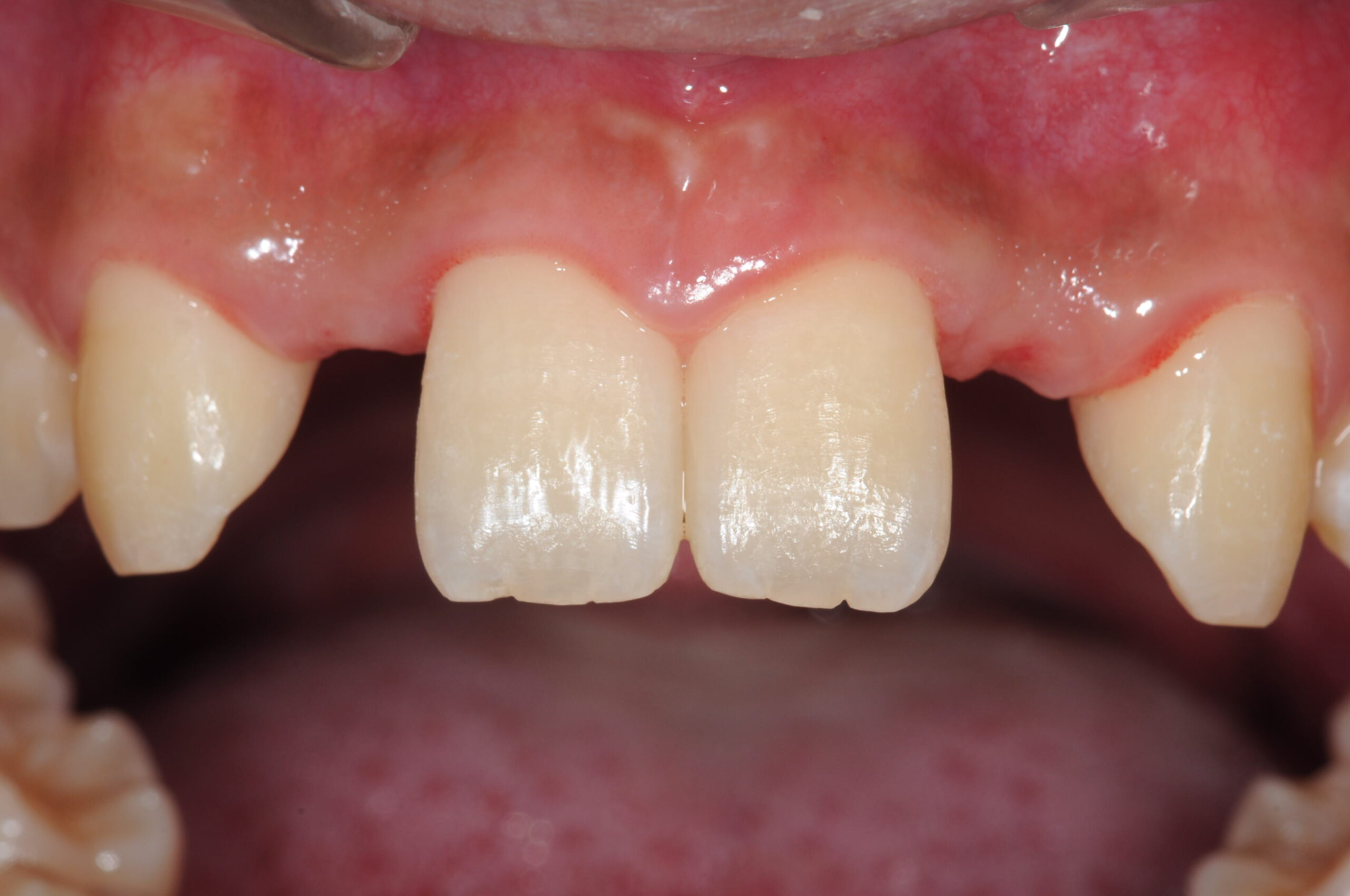 | 治療経過 | 矯正医からの依頼で、先天的に欠損した上顎の両側側切歯に歯を入れて欲しいとのことで来院された。 第一選択肢としてはインプラントだが、年齢的にも若く、インプラントオペの難易度も低い症例ではなかったため、一旦仮歯を接着した後に、歯の切削をほとんど必要としないセラミックによる接着性ブリッジにて修復した。 |