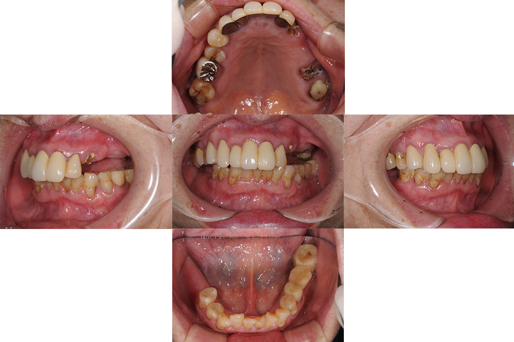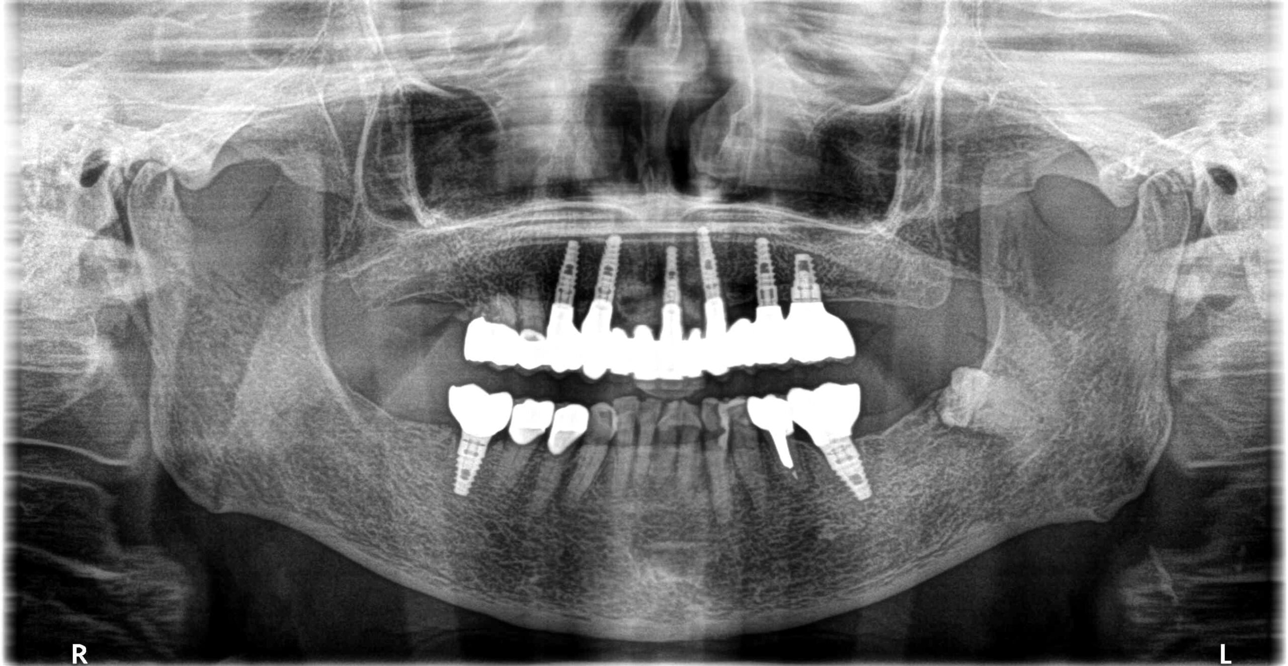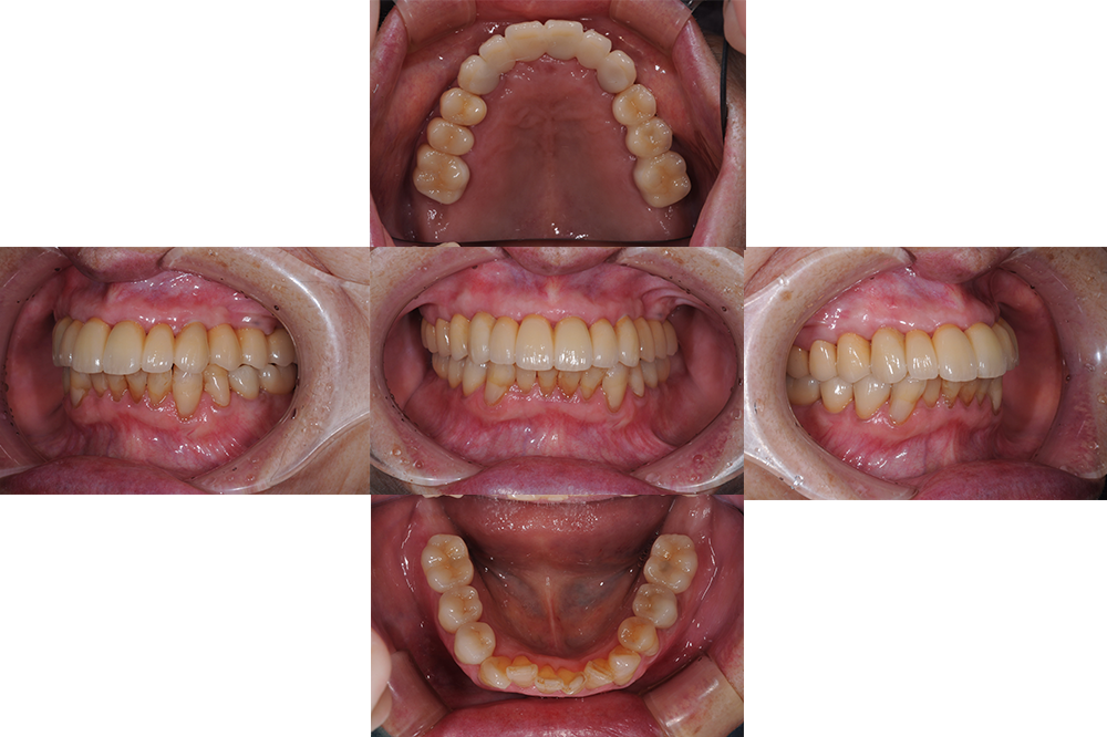上顎は長期的な予後が見込める歯が少なく多数のインプラントを必要としたが、一時的にも義歯を使うことなく、咬める場所を温存しながらインプラントへと移行できた。